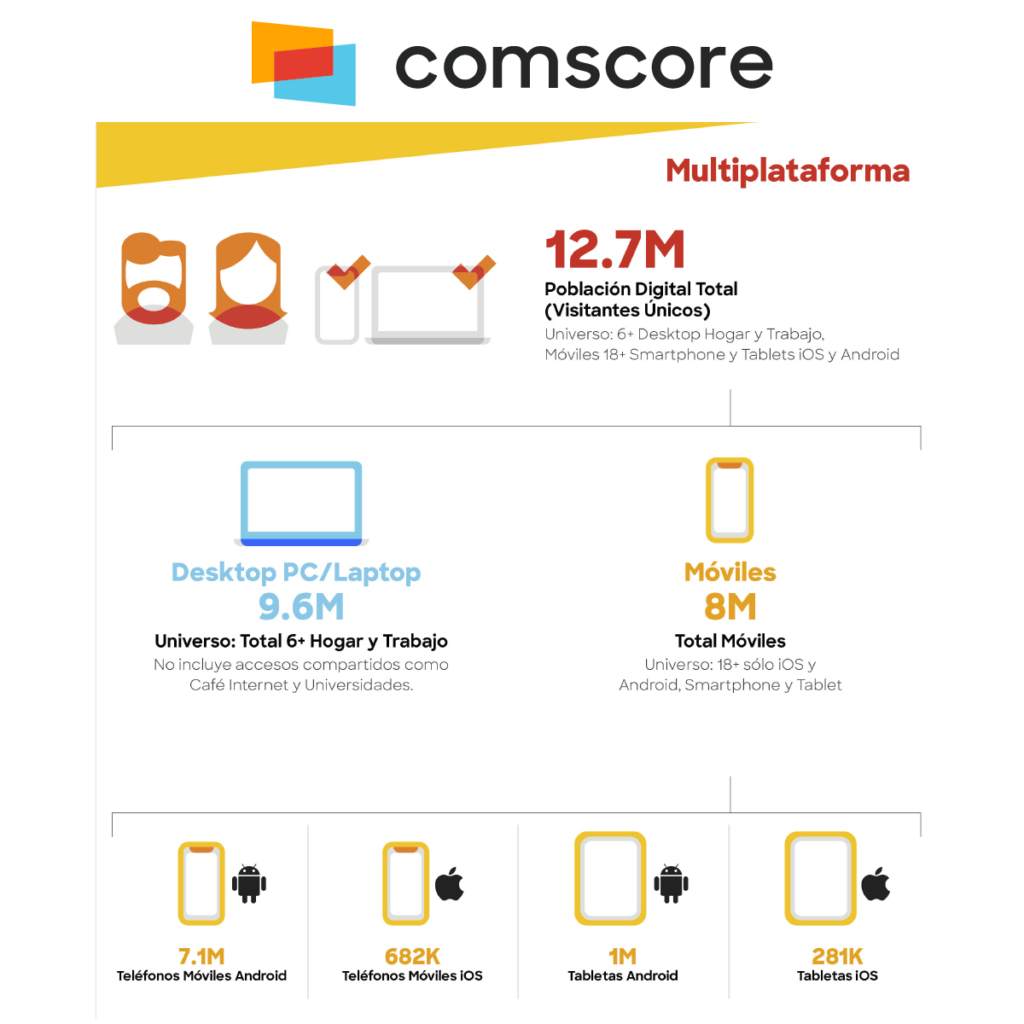 - 8M de usuarios de 18 años en adelante acceden a internet a través de dispositivos móviles (teléfonos móviles y tablets iOS y Android).