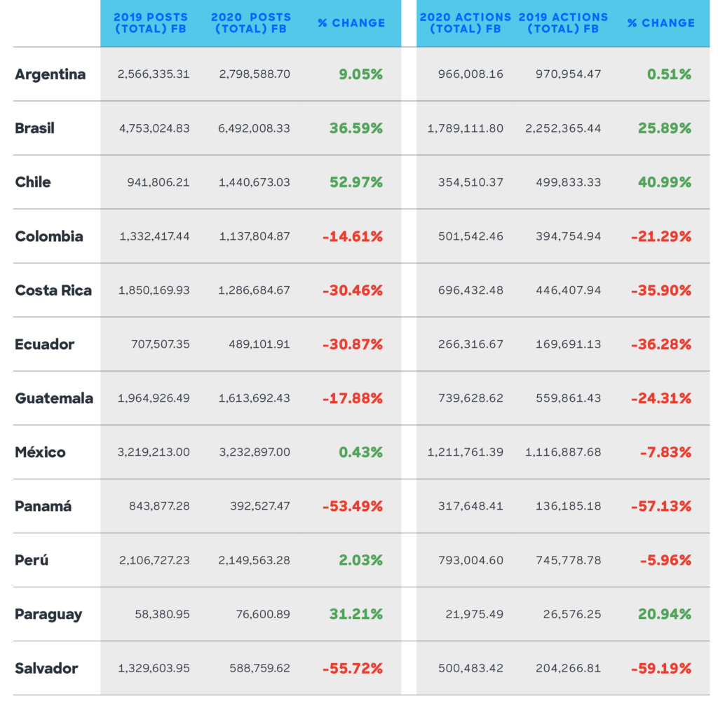 De acuerdo con los datos de Shareablee para América Latina; Argentina, Brasil, Chile y Paraguay son los países de la región que mayor porcentaje de cambio en el número de publicaciones e interacciones multiplataforma de social media registraron durante marzo 2020 en comparación al año anterior.