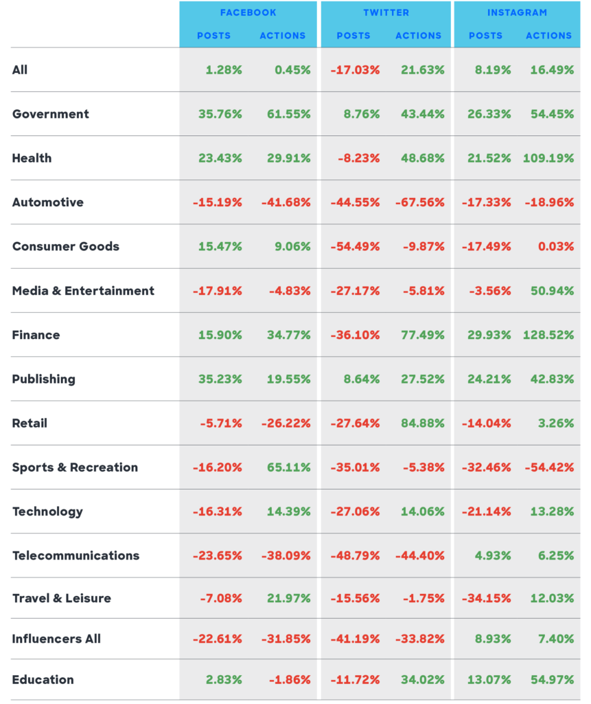Los números extraídos de la plataforma Shareablee, nos indican que los mayores niveles de engagement se obtuvieron en la red social Instagram en las categorías de “Finance” y “Health”, ambas superando un 100% de aumento en las interacciones entre marzo 2019 y marzo 2020.