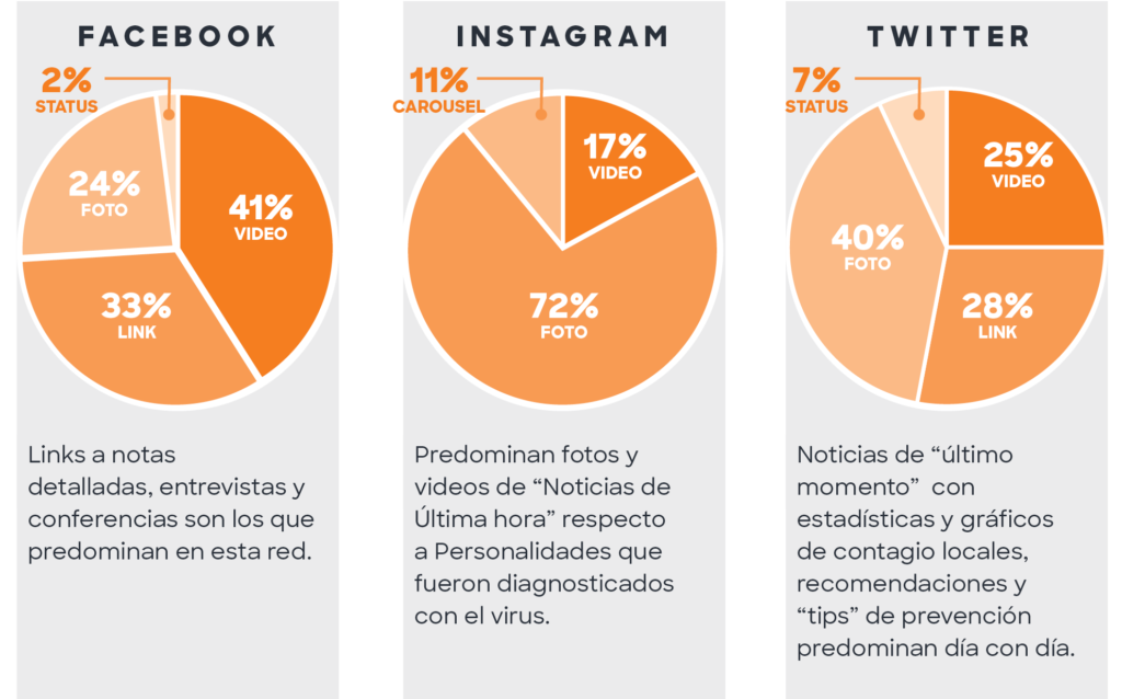 En Facebook los links a notas detalladas, entrevistas y conferencias son los que predominan, mientras que en Instagram lo hacen las fotos y videos de “Noticias de Última hora” respecto a Personalidades que fueron diagnosticados con el virus. Por otro lado, Twitter se convierte en la red social de noticias de “último momento” con estadísticas y gráficos de contagio locales, recomendaciones y “tips” de prevención predominan día con día.