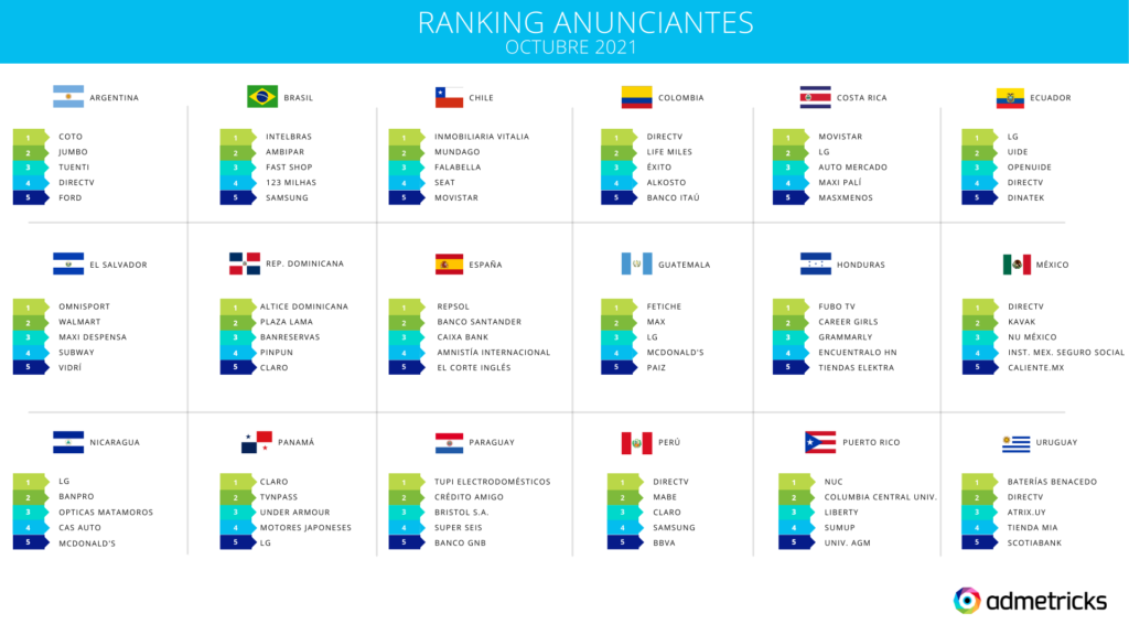 En este reporte se puede ver cuales son las marcas que más están invirtiendo, que en el caso de Argentina, para el mes de octubre 2021 son: Coto, Jumbo y Tuenti. En Brasil: Intelbras, Ambipar y Fast Shop. En Chile: Inmobiliaria Vitalia, Mundago y Falabella. En Colombia: Directv, Life Miles y Éxito. En España: Repsol, Banco Santander y Caixa Bank. En México: Directv, Kavak y NU México; y en Perú: Directv, Mabe y Claro.