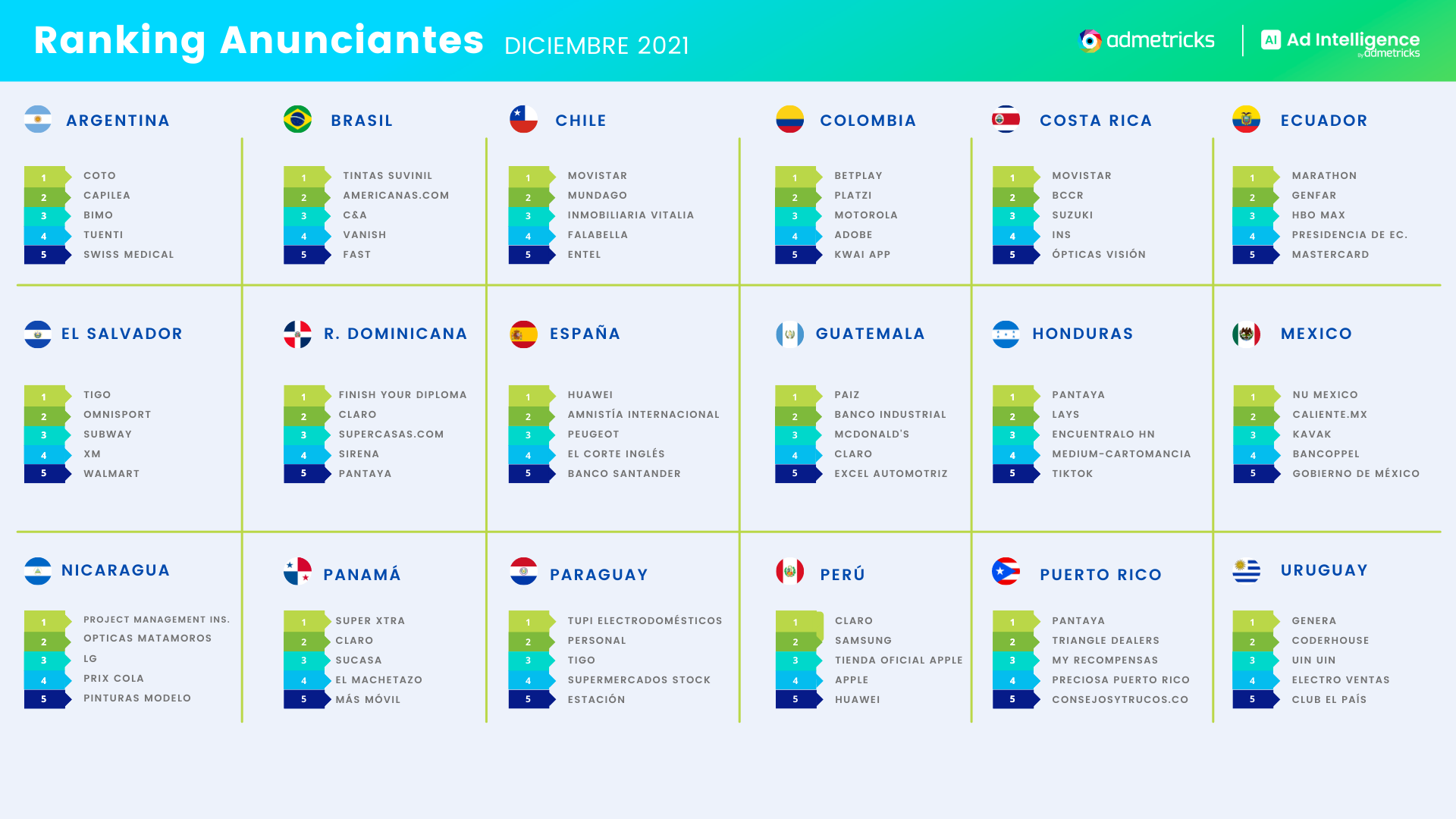 En este reporte se puede ver cuales son las marcas que más están invirtiendo, que en el caso de Argentina, para el mes de diciembre 2021 son: Coto, Capilea y Bimo. En Brasil: Tintas Suvinil, Americanas.com y C&A. En Chile: Movistar, Mundago y Inmobiliaria Vitalia. En Colombia: Betplay, Platzi y Motorola. En España: Huawei, Amnistía Internacional y Peugeot. Y en México: Nu México, Caliente MX y Kavak.