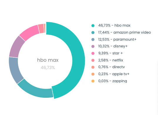 En cuanto a inversión, las cinco principales marcas de la industria son las siguientes: en primer lugar, HBO Max con un 46,73%; en segundo lugar, Amazon Prime Video con un 17,44%; en tercer lugar, Paramount+ con un 12,53%; en cuarto lugar, Disney+ con un 10,32%; y por último, Star+ con un 9,39%.