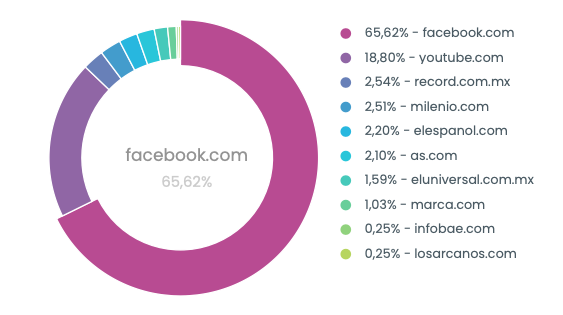 Sitios web: facebook.com (57,88%), youtube.com (32,76%), unotv.com (2,64%), unam.mx (0,89%), eluniversal.com.mx (0,66%), uol.com.br (0,57%), diario.mx (0,53%), espn.com.mx (0,31%), yahoo.com (0,28%), marca.com (0,26%)